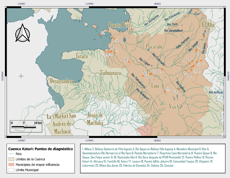 De acuerdo con la delimitación del Ministerio de Medio Ambiente y Agua (MMAyA), la cuenca Katari ocupa el territorio actual de 23 municipios. El río Katari guarda una estrecha relación con al menos 9 municipios desde su nacimiento en Comanche hasta su desembocadura en el lago. Para 2020, los 9 municipios de mayor influencia urbana sobre la cuenca contaban con 1.130.735 habitantes, lo que representa el 10% de la población boliviana por lo que se trata de una de las cuencas más presionadas demográfica y ambientalmente en el país. Entre estos, los municipios de mayor peso demográfico son El Alto y Viacha, concentran al 91% de la población de la cuenca, mientras que Puerto Pérez, Pucarani y Laja más próximos a la orilla del lago son los más afectados por la contaminación pues dependen hasta en un 60% de la calidad del agua y la tierra para vivir, muestran peor distribución de tierra. El 20% más rico en Colquencha, Puerto Pérez y Pucarani concentra entre el 65% y el 71% de la tierra productiva lo cual hace a estos municipios más propensos a afectaciones severas de sus escasos medios de vida.